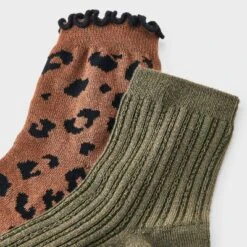 Women’s Leopard Print Ruffle Trim Ultra Soft 2pk Ankle Socks – Auden™ Brown/Black/Olive Green 4-10