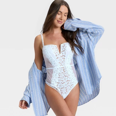 Cover yourself in chic comfort with this Crochet Lace V-Wire Lingerie Bodysuit from Auden™. This lingerie bodysuit showcases crochet lace trimming down the front and is defined by a flattering V-neckline. Made from soft nylon with added spandex and a cotton gusset, this pull-on lingerie bodysuit offers comfortable wear that moves with you.