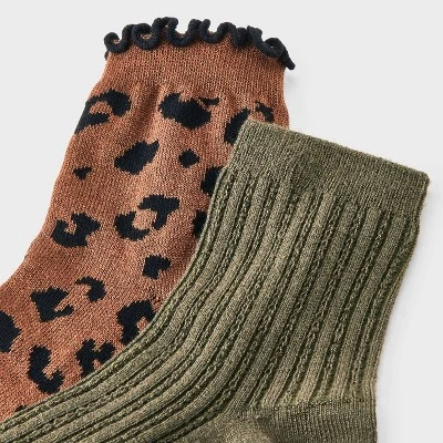 Stock your sock drawer with a stylish twist in the Women’s Leopard Ruffle Trim Ultra Soft 2pk Ankle Socks from Auden™ in Brown/Black/Olive Green. This fashionable two-pack features midweight knit socks with a cozy feel and eye-catching leopard prints that add a playful edge to any look. Finished with delicate ruffle trim for a touch of sweetness, these unlined ankle socks are perfect for pairing with boots or sneakers.